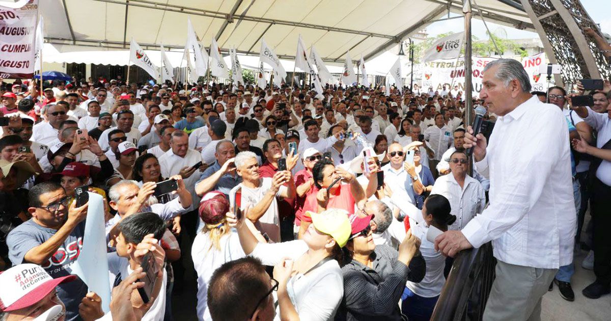 Durante su participación en la asamblea, se alcanzó a escuchar: “¡Petroleros con Adán, petroleros con Adán!”, le gritaron a Adán Augusto López Hernández en la asamblea que encabezó en Tampico, en su tercer día en Tamaulipas, la entidad a la que más tiempo ha dedicado en estas dos semanas de recorrido por el país.