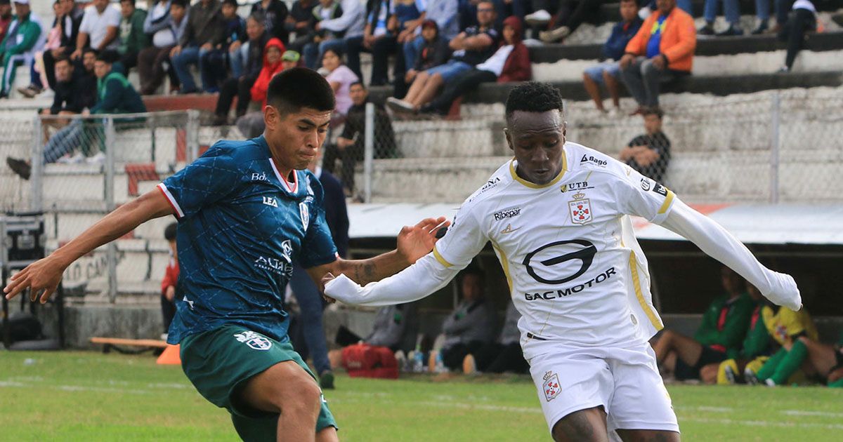BOL01 LA PAZ (BOLIVIA) 22-03-2024.- El futbolista Guillermo Denis Beltrán de Real Santa Cruz (d) disputa el balón en un encuentro contra Tomayapo el 17 de julio de 2023 en Santa Cruz (Bolivia). El futbolista colombiano Guillermo Denis Beltrán falleció este viernes tras desplomarse en una práctica de su equipo el Real Santa Cruz de Bolivia. EFE/Juan Carlos Torrejón