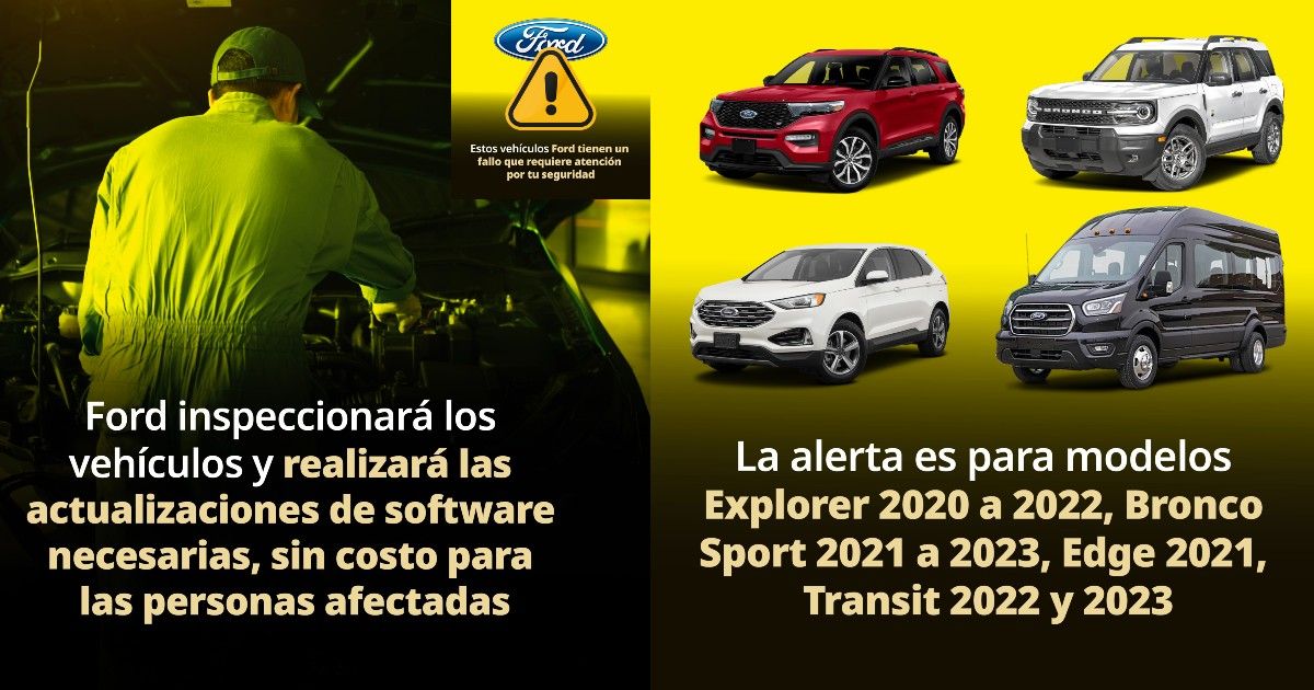 Ford revisará los vehículos y actualizará el software sin costo para los afectados. Los modelos involucrados son Explorer (años 2020 a 2022), Bronco Sport (2021 a 2023), Edge (2021), así como Transit (2022 y 2023)