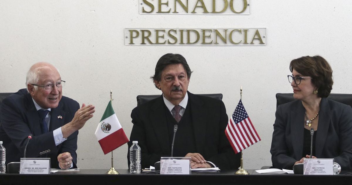 Ken Salazar, embajador de los Estados Unidos en México y los senadores Patricia Mercado y Napoléon Gómez Urrutia durante el encuentro de la Comisión de Trabajo y previsión Social en la Cámara de Senadores.