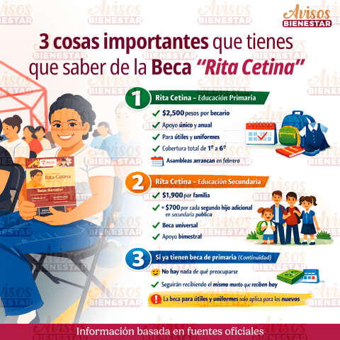 La Secretaría de Educación Pública (SEP) informó que en febrero de 2026 comenzarán las asambleas informativas sobre la Beca Rita Cetina. Estas sesiones estarán dirigidas a los padres y tutores de los estudiantes de primaria, explicando monto, beneficios y requisitos para acceder al apoyo.