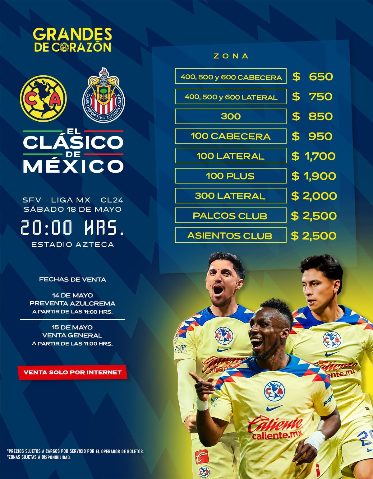 - América vs Chivas (Juego de Vuelta): El emocionante juego de vuelta se disputará el sábado 18 de mayo a las 20:00 hrs en el Estadio Azteca. La preventa inicia este martes 14, y la venta general se abrirá el miércoles 15 a través de Ticketmaster. Para este encuentro, América ha duplicado el precio de los boletos en comparación con su juego anterior contra Pachuca, con el boleto más económico a 650 pesos y el más caro a 2,500 pesos.