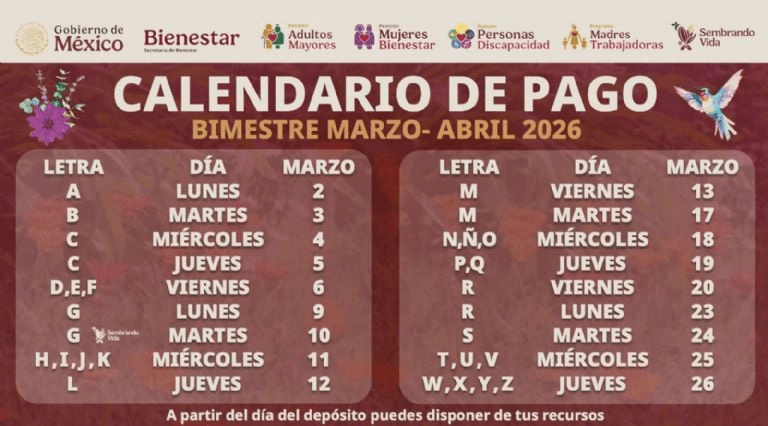Calendario oficial de pagos marzo-abril 2026