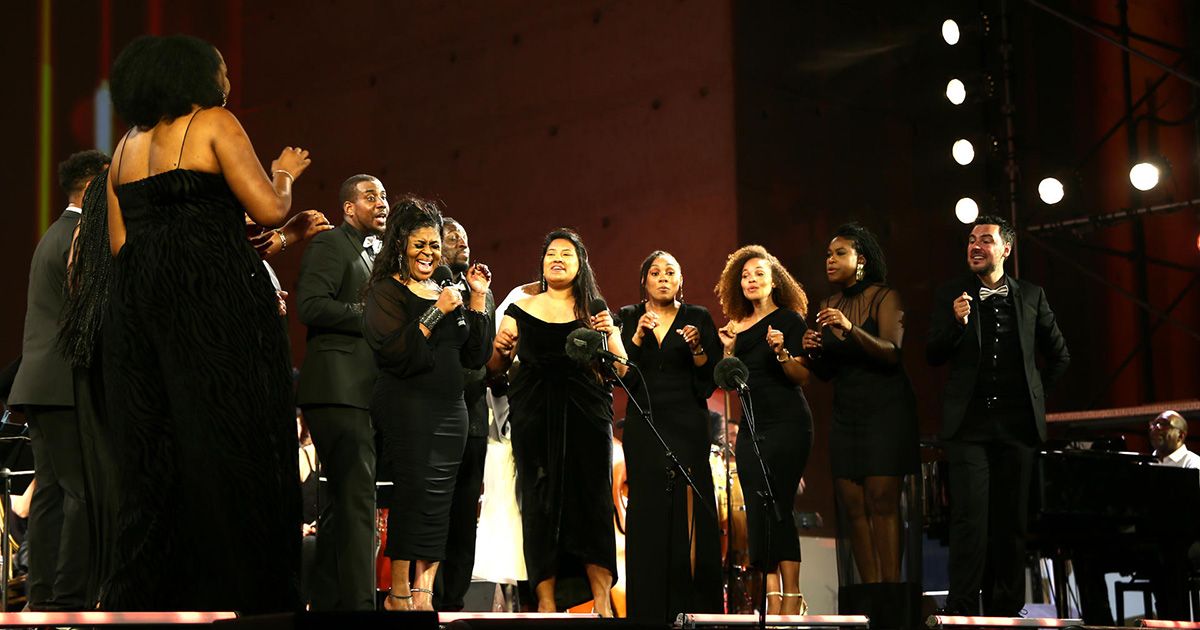 FEZ, 02/06/2024.- La cantante estadounidense Kim Burrell (3i) acompañada por la ‘Gospel Philharmonic Experience’ durante el concierto que cerró este sábado la 27 edición del Festival de Músicas Sacras de Fez. EFE / Maria Transpaderme.