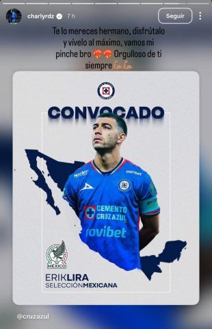“Te lo mereces, hermano. Disfrútalo y vívelo al máximo, vamos mi pinche bro. Orgulloso de ti siempre”, escribió Charly Rodríguez en Instagram, acompañando la publicación de Cruz Azul sobre la convocatoria de Lira.