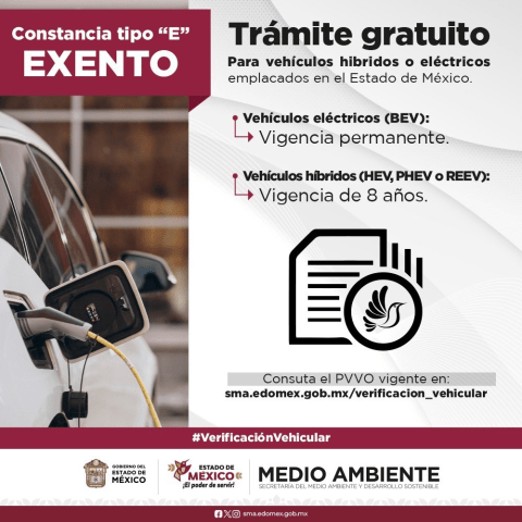 Los vehículos elegibles para la constancia tipo “E” deben contar con alguna de las siguientes motorizaciones: eléctricos (BEV), híbridos (HEV), híbridos enchufables (PHEV) o eléctricos con autonomía extendida (REEV). En el caso de los BEV, la exención de verificación es permanente, mientras que los demás tipos de híbridos quedan exentos por un periodo de ocho años.