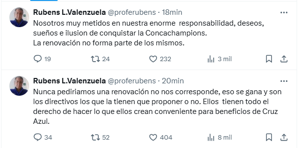 A través de su cuenta personal de “X” el profesor Rubens Valenzuela dejó en claro, que están enfocados en ganar la final de la Concacaf Champions Cup, y que la renovación se gana a base de resultados, además de depender de lo que digan los directivos de la institución.