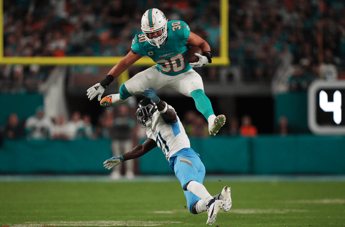 El siete veces Pro Bowler se quedó en un costado del campo con una mirada de frustración que no podía esconder tras su lesión. Los Dolphins lucían inoperantes sin su estrella, pero la defensiva dio la cara por el equipo. Will Levis pase corto destinado a Spears pero fue interceptado por Zach Sieler en plena yarda cinco de Tennessee, por lo que llevar el ovoide a las diagonales fue pan comido para el pick-six.