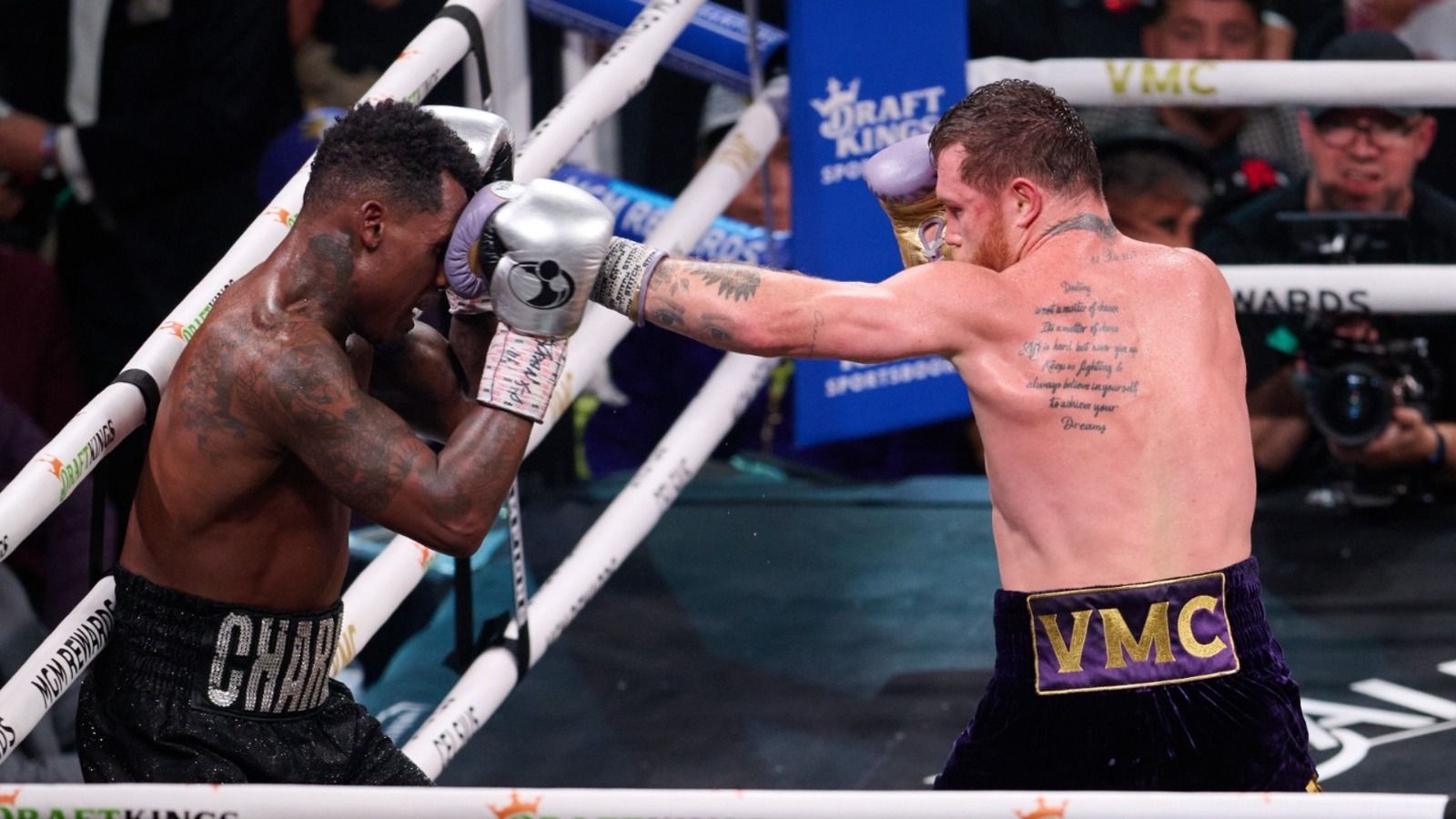 Saul – Canelo- Alvarez (MEX) and Jermell Charlo (USA) during the Boxing fight for the super middleweight titles of the World Boxing Association (WBA), International Boxing Federation (IBF), World Boxing Council (WBC) and the World Boxing Organization (WBO), at T-Mobile Arena on September 30, 2023.