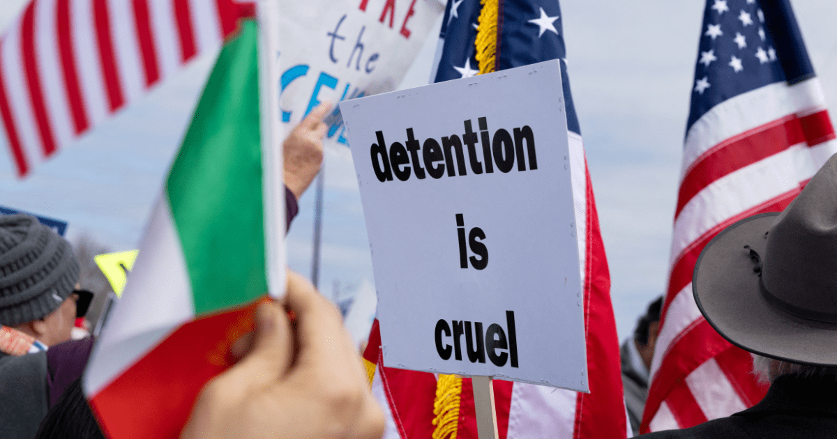 Manifestantes sostienen pancartas con el mensaje: “La detención es cruel”. | Foto: Reuters