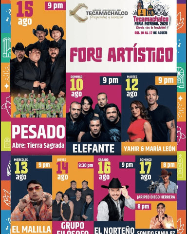 Este año la cartelera no decepcionará pues contará con la presencia de grandes artistas como Elefante, María León y Yahir, Grupo Pesado, El Malila y el comediante El Norteño.