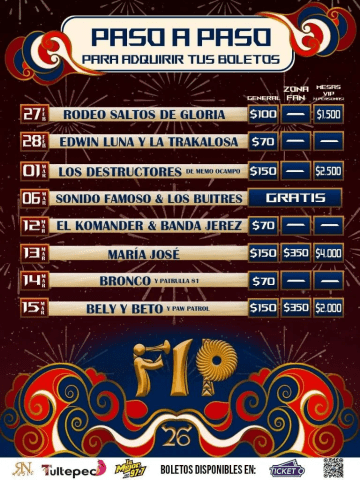 El festival contará con figuras de talla internacional, por lo que los asistentes podrán adquirir tickets preferenciales para disfrutar de mayor comodidad y mejor vista del escenario. La feria combina música, tradición y entretenimiento en cada jornada.