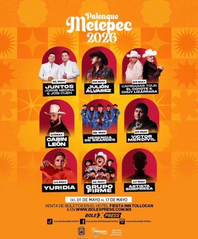 La venta de boletos comenzará el viernes 6 de marzo a través de los canales oficiales. Las entradas podrán adquirirse en línea en el sitio feriametepec2026.com o en el punto de venta físico ubicado en el Hotel Fiesta Inn Tollocan, con horario de lunes a viernes de 10:00 a 18:00 horas y sábados de 10:00 a 15:00 horas.