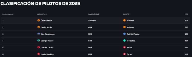 La Fórmula 1 está entrando en su etapa cumbre y tras 16 carreras disputadas, Oscar Piastri y Lando Norris se pelean por el campeonato de pilotos a pesar de ser de la misma escudería, la diferencia entre ambos es de tan solo de 31 puntos, mientras que el actual campeón, Max Verstappen viene en el tercer peldaño muy rezagado de los pilotos de Mclaren, Norris, quien es segundo mantiene una ventaja de 63 unidades sobre el neerlandés que suma 230 unidades.