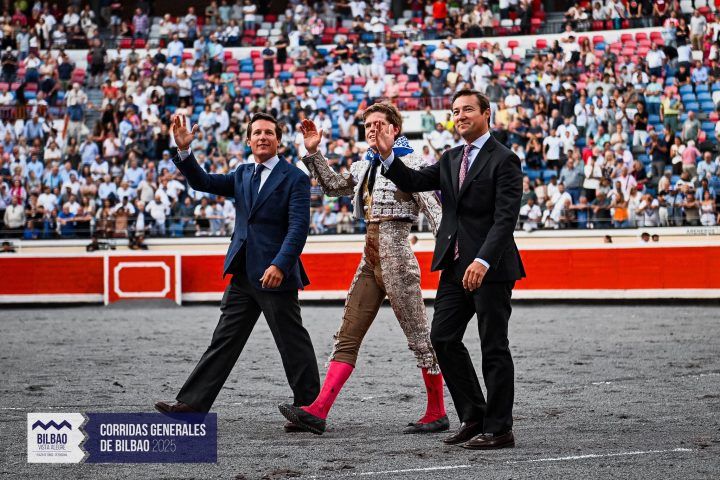 Bilbao vivió una tarde histórica en su feria con una corrida mixta en la que Guillermo Hermoso de Mendoza, Emilio de Justo y Borja Jiménez lidiaron toros de Fermín Bohórquez y La Quinta. El gran protagonista fue “Tapaboca”, extraordinario ejemplar de La Quinta, indultado tras una faena de entrega y torería de Borja Jiménez. El rejoneador cortó una oreja al cuarto, mientras que De Justo destacó por su mérito frente al exigente quinto. Una tarde de emoción que quedará marcada por la bravura y el indulto en Vista Alegre.