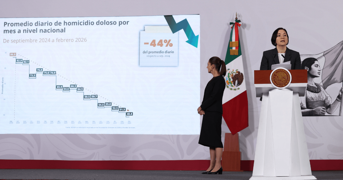 Durante la conferencia matutina en Palacio Nacional, la mandataria explicó que la tendencia descendente se mantuvo durante 17 meses consecutivos. El reporte indica que el promedio nacional pasó de 86.9 homicidios diarios al inicio de la actual administración a 48.8 en febrero de 2026, lo que representa 38 víctimas menos cada día respecto a septiembre de 2024.
