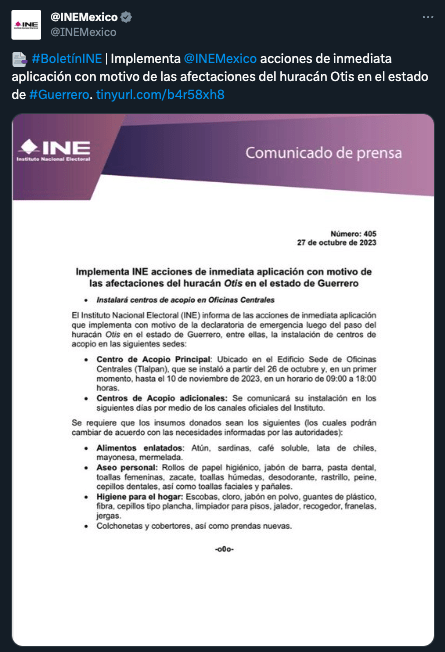 El Instituto Nacional Electoral (INE) informó que con el propósito de enviar ayuda a los damnificados de Guerrero por el paso del huracán Otis instaló un centro de acopio el edificio central de sus oficinas en Tlalpan a partir del 26 de octubre y, en un primer momento, hasta el 10 de noviembre de 2023, en un horario de 9:00 a 18:00 horas.