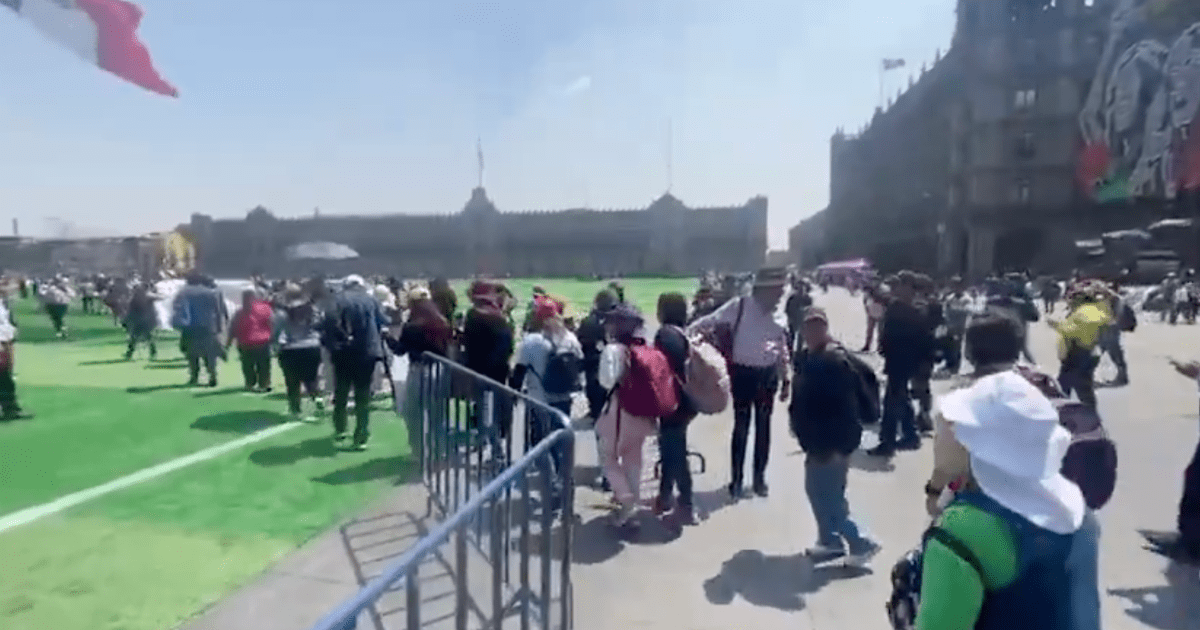 Alrededor de un centenar de manifestantes irrumpieron en el zócalo capitalino mientras se realizaba la colocación del césped artificial para la megaclase de futbol que se efectuará este domingo.