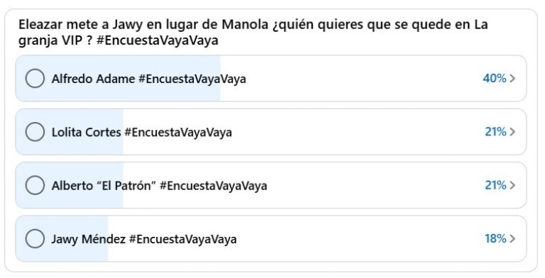 Según la encuesta de “Vaya Vaya”, Alfredo Adame se mantiene como el participante más seguro dentro del reality, con el 40% de las preferencias. Le siguen Lolita Cortés y El Patrón, ambos con 21%, mientras que en la parte baja se encuentra Jawy, con 18%, cifra que incluye los votos de Manola Díez, quien fue removida de la nominación.