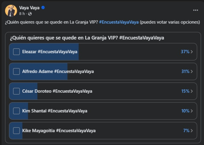 La encuesta de ‘Vaya, Vaya’, administrada por Gerardo Escareño, vuelve a perfilar tendencias decisivas. Según las cifras preliminares, Kim Shantal y Sergio Mayer Mori mantienen un sólido respaldo de sus bases de fans, por lo que no figuran entre los posibles eliminados de esta semana.