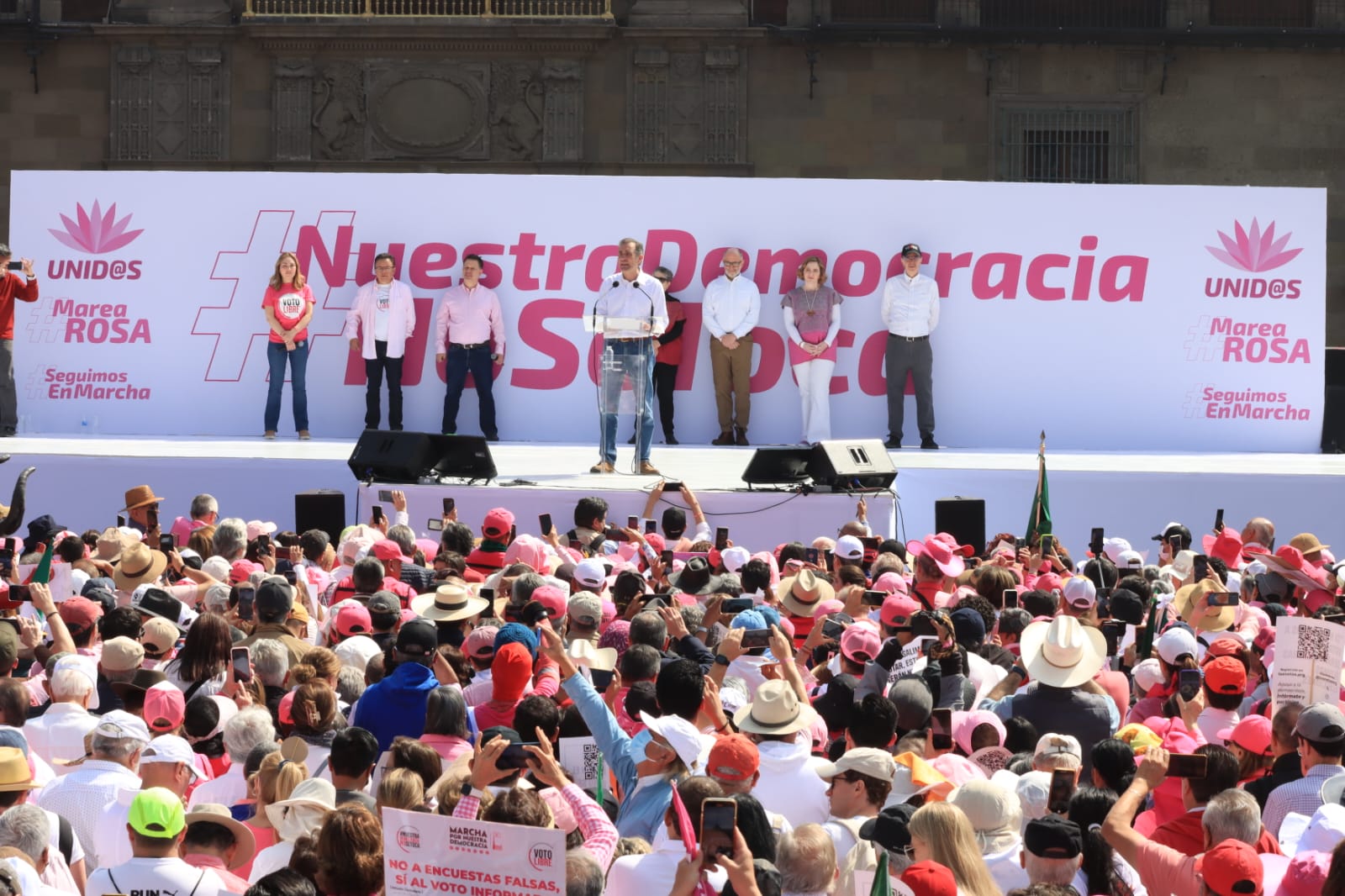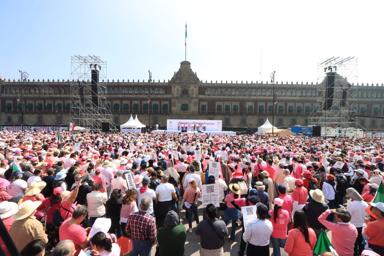 Con un Zócalo pletórico, donde la marea rosa de nueva cuenta se dejó ver, miles de mexicanos exigieron el respeto al voto libre, a las instituciones, la no intervención del narco y que el presidente Andrés Manuel López Obrador saque las manos de los comicios de este año.