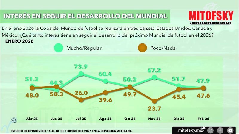 1.- La baja expectativa por la selección e incluso la poca información que hay sobre los grupos o los buenos juegos que podremos presenciar, hace que aún no podamos afirmar que los aficionados están “metidos” en el mundial. En febrero, baja de 52% a 48% el grupo de aficionados que se dice interesado en seguir las noticias del mundial, el menor valor desde julio del año pasado.