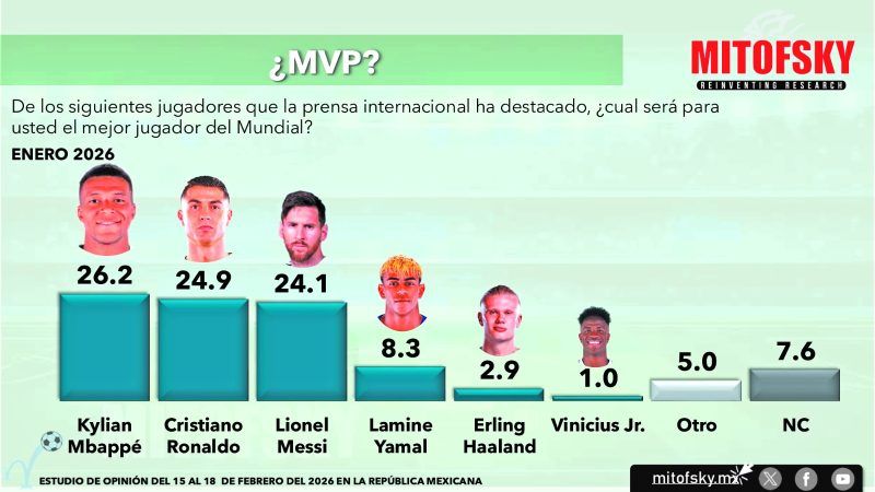 5.- ¿Quién será el Jugador más valioso del mundial? Hace cuatro años no hubo duda, fue Messi, sin embargo para 2026 parece que hay un cambio de generación ya que Mbappé sustituye a Ronaldo y a Messi como quien se espera brille sobre el resto. Los tres con porcentajes similares (26%, 25% y 24% respectivamente). Además de ellos, la afición espera ver triunfar a Yamal, Haaland y Vinicius Jr.