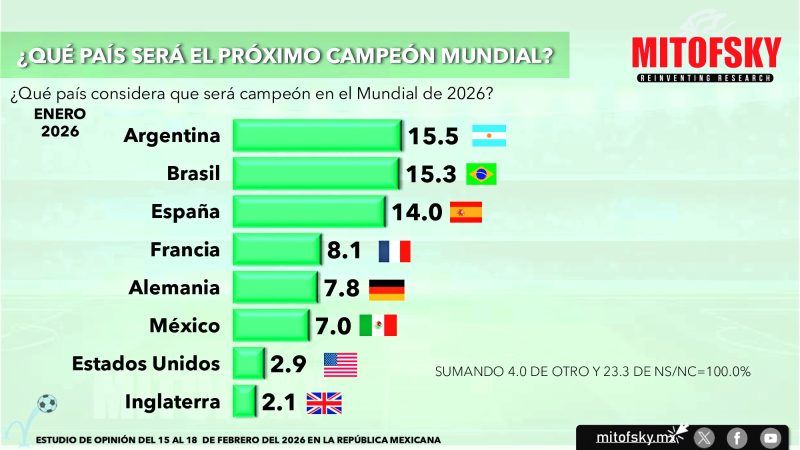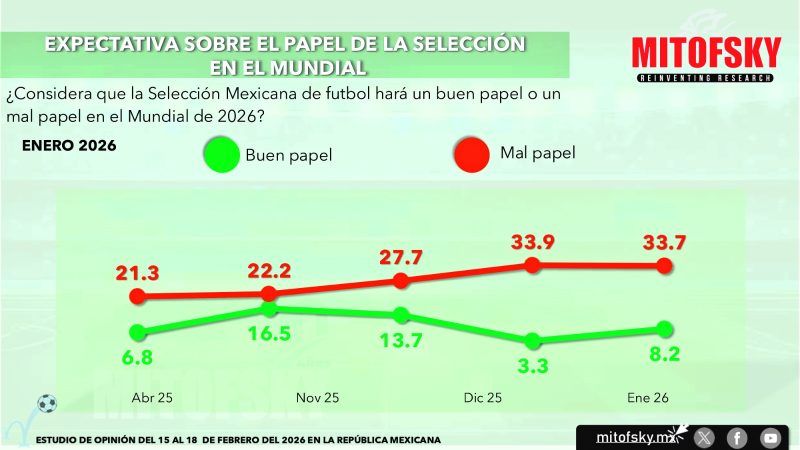 3.- El porcentaje de mexicanos que consideran que la selección mexicana tendrá un buen desempeño en el mundial sigue siendo raquítico, aunque entre enero y febrero sube de 3% a 8%, en cambio uno de cada tres aficionados afirman que haremos un mal papel en la justa.
