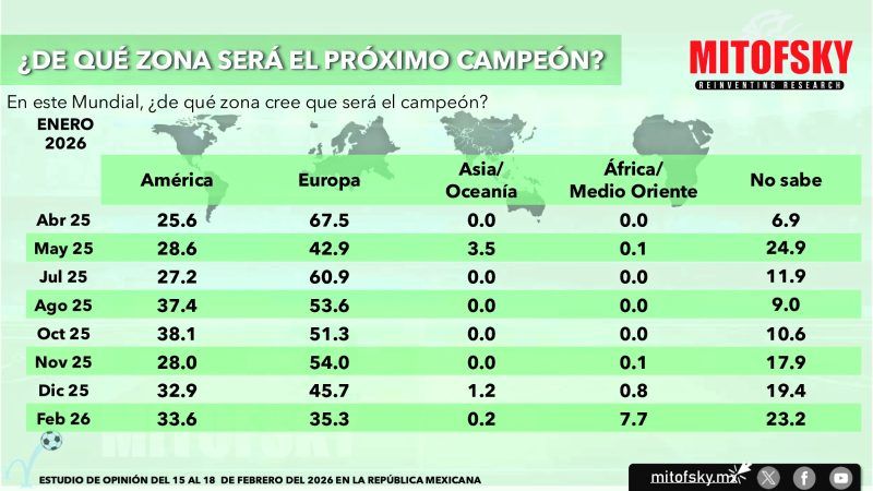 4.- Europa sigue dominando en la expectativa para ser campeón, sin embargo nunca había estado tan reñida la opinión con respecto a América, 35% opina que el campeón surgirá de Europa y 34% de América. Este cambio se debe a que Brasil y Argentina aparecen ahora como los dos países con mayor probabilidad de ser campeones, en cambio para Europa se dividen preferencias entre España, Francia, Alemania e Inglaterra. Es muy probable que estas opiniones se vayan modificando conforme los veamos jugar o tengamos noticias de la fuerza con la que llegan a la gesta mundialista.