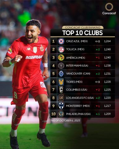 El ranking actualizado al 6 de octubre de 2025 también incluye a Tigres, que conserva el sexto puesto con 1,228 puntos, y a Rayados de Monterrey, que se ubica en el noveno lugar con 1,217 unidades.