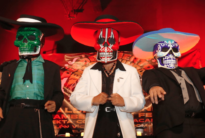 MEX9179. CIUDAD DE MÉXICO (MÉXICO), 24/10/2023.- Los integrantes de la agrupación mexicana Maldita Vecindad, Enrique Montes (i), Rolando Ortega (c) y Aldo Acuña (d) posan durante la presentación del festival “Día de muertos en la vecindad: ofrenda a los ancestros”, en la Ciudad de México (México). Por tercer año consecutivo la banda mexicana Maldita Vecindad celebrará el Día de Muertos, una de las celebraciones más relevantes en el país, con un concierto, pero esta vez contará con otros grupos que, junto a ellos, celebrarán la tradición popular que ha revivido en los últimos años . EFE/Mario Guzmán