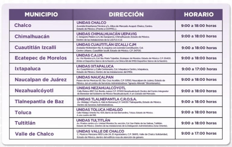El registro se llevará a cabo del 30 de julio al 1 de agosto de 2025, de manera presencial en las unidades UNIDAS ubicadas en los siguientes municipios: Chalco, Chimalhuacán, Cuautitlán Izcalli, Ecatepec, Ixtapaluca, Naucalpan, Nezahualcóyotl, Tlalnepantla, Toluca, Tultitlán y Valle de Chalco. Es indispensable acudir en las fechas establecidas con la documentación completa.