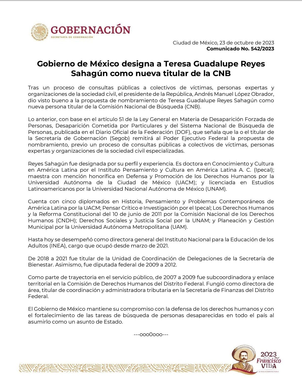 Por la tarde, desde un mensaje en redes sociales, la secretaria de Gobernación, Luisa María Alcalde Luján informó que el presidente Andrés Manuel López Obrador había dado el visto bueno a la propuesta de nombramiento de Reyes Sahagún, como nueva persona titular de la Comisión Nacional de Búsqueda (CNB).