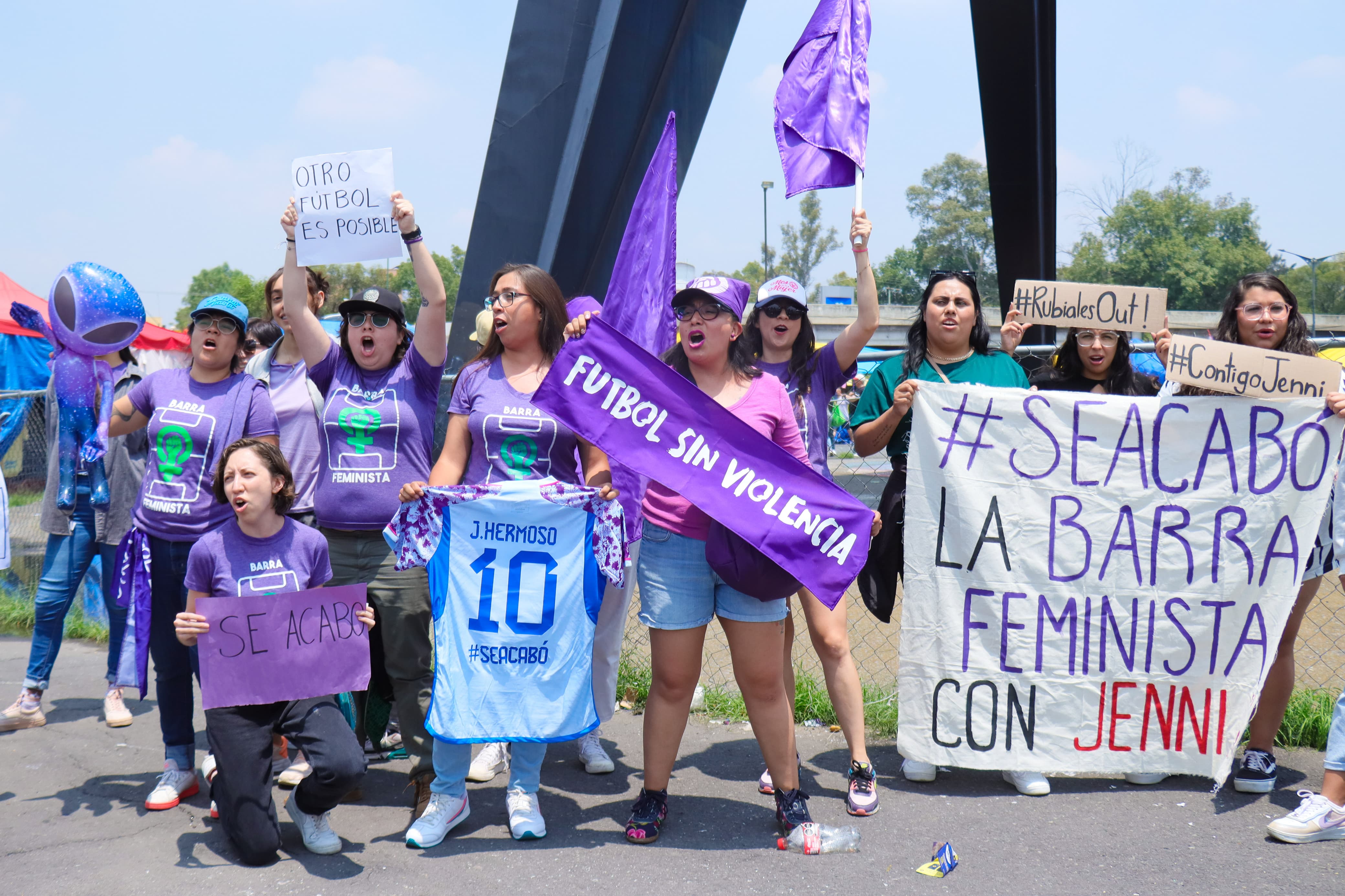 La Barra Feminista de México aprovechó el duelo entre azulcremas y merengues para gritar al mundo su repudio a este acto. Con mantas, cantos y un jersey del Pachuca Femenil con el dorsal de Hermoso estampado, el grupo de mujeres causó eco en la explanada del Coloso de Santa Úrsula.