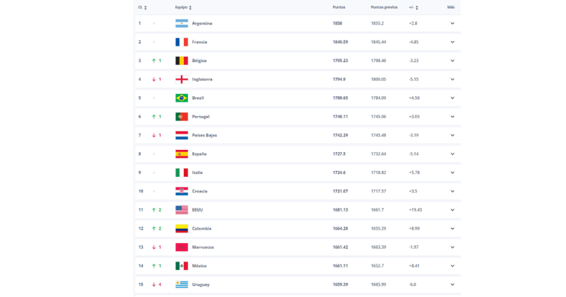 Argentina sigue sólida en la primera posición seguida de Francia. Brasil es quinto, mientras que España está en octavo, Italia en noveno y el Top 10 lo cierra Croacia.