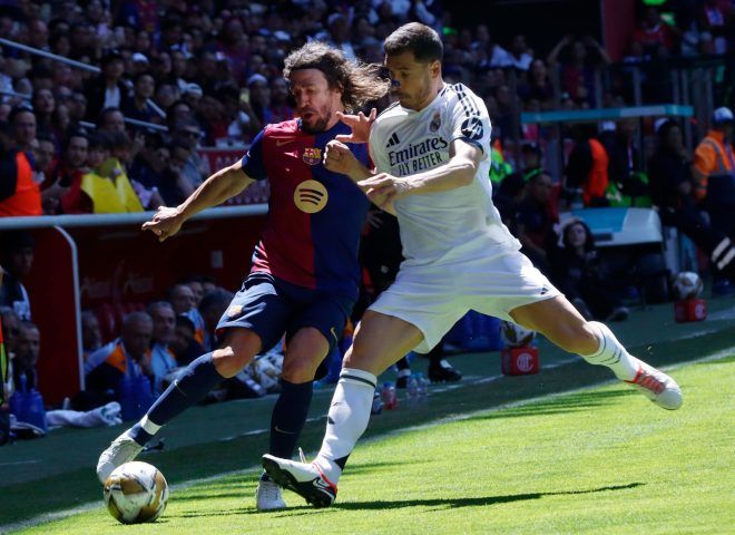 “¡Ay, ay, ay, ay… canta y no llores…”, comenzó a escucharse en las gradas, como parte de la fiesta en el Clásico de Leyendas. Inevitablemente, los titulares comenzaron a salir uno a uno. Todos excepto Rafa y Puyol, quienes seguían en defensa con el compromiso de siempre por defender la camiseta del Barcelona.