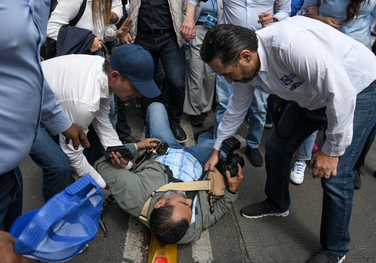 🚨 #AlMomento | Durante la marcha, personal de seguridad del Partido @AccionNacional tiró al suelo a un fotógrafo y agredió físicamente a otros periodistas, empujándolos y jaloneándolos con violencia. 📸😡
