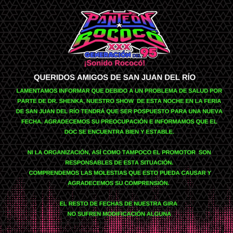 Los integrantes de Panteón Rococó informaron que el concierto de Querétaro será reprogramado para una nueva fecha que será anunciada próximamente, mientras que agradecieron profundamente a sus miles de seguidores la comprensión, el apoyo y la preocupación mostrada durante este momento delicado.
