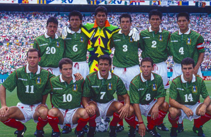 Primera Copa del Mundo tras la suspensión de 1990. Esta camiseta era verde oscuro, con cuello polo blanco y detalles rojos. Sobria, noventera y clásica. La usó Jorge Campos, Luis García y Hugo Sánchez (en su último Mundial).
