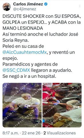 De acuerdo con información difundida por el periodista Carlos Jiménez, el gladiador sostuvo una discusión con su esposa, la cual fue subiendo de tono hasta derivar en un momento de tensión que terminó con el luchador lesionado.