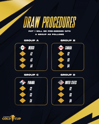 El sorteo se realizará con cuatro bombos que contienen a las demás selecciones participantes. En el Bombo 2 se encuentran Costa Rica, Jamaica, Honduras y Haití; el Bombo 3 incluye a Guatemala, Trinidad y Tobago, El Salvador y Surinam; mientras que el Bombo 4 está conformado por Guadalupe, Curazao, República Dominicana y Arabia Saudita. El sorteo definirá los integrantes de los Grupos B, C y D, encabezados por Canadá, Panamá y Estados Unidos, respectivamente.