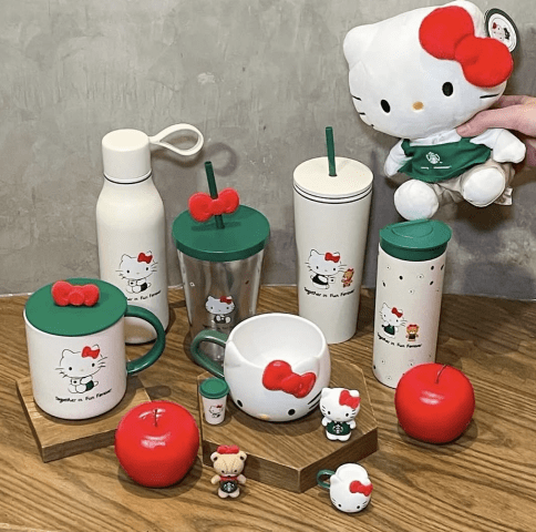 Cada pieza destaca por integrar los elementos distintivos de ambas marcas: el verde característico de Starbucks y los tonos rosas y rojos que identifican a Hello Kitty, especialmente su emblemático moño rojo.