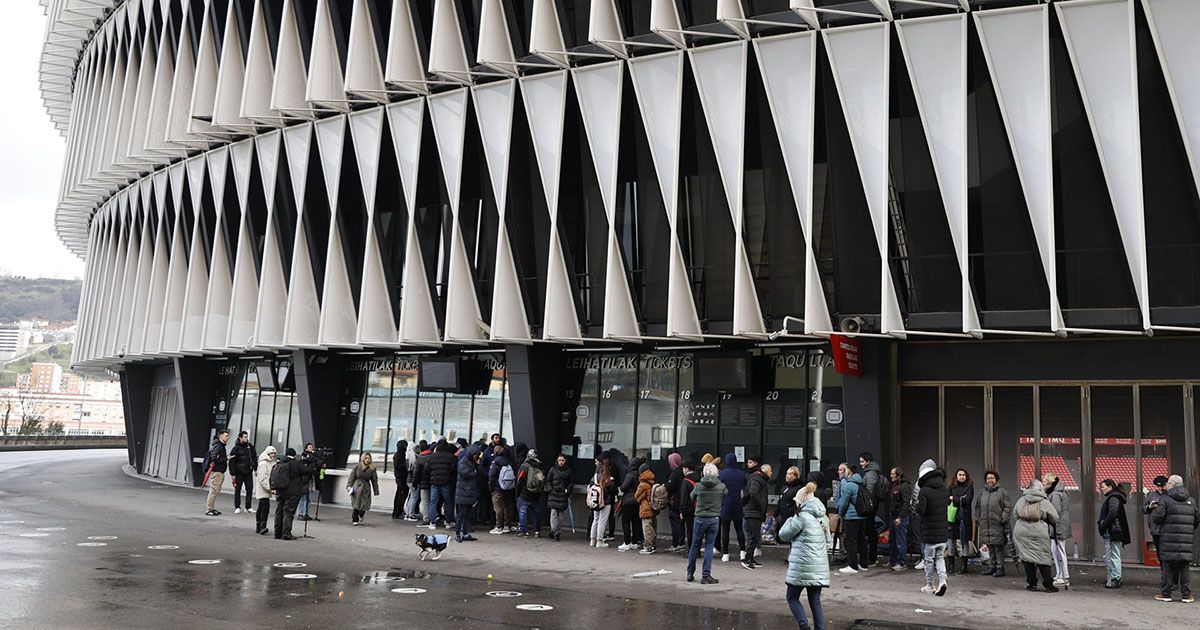 GRAFCAV9424. BILBAO, 28/02/2024.-Aficionados tras pasar la noche haciendo cola en San Mamés, esperan para adquirir las últimas entradas, donde el Athletic Club jugará mañana jueves la vuelta de las semifinales de la Copa del Rey, contra el Athletico de Madrid, con el objetivo de alcanzar la 40ª final de su historia en el torneo que sería además la sexta de los últimos 15 años. EFE/Luis Tejido