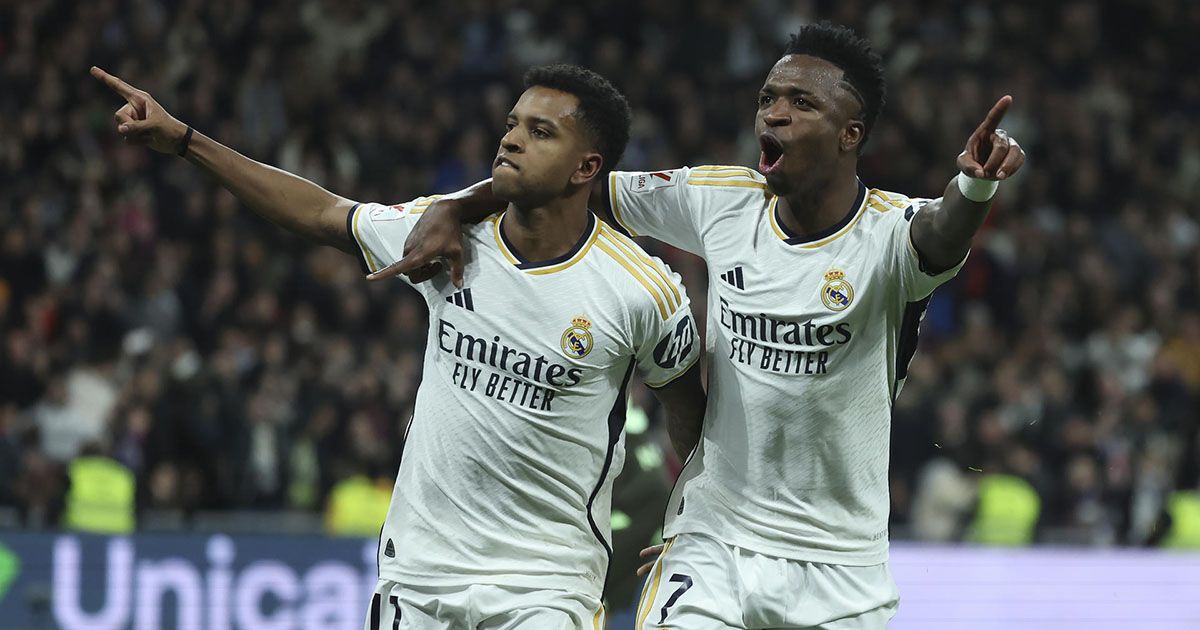 MADRID, 10/02/2024.- Los jugadores brasileños del Real Madrid, Rodrygo (i) y Vinicius Jr., celebran el cuarto gol del equipo madridista durante el encuentro correspondiente a la jornada 24 de primera división que disputan hoy sábado Real Madrid y Girona en el estadio Santiago Bernabéu, en Madrid. EFE / Kiko Huesca.