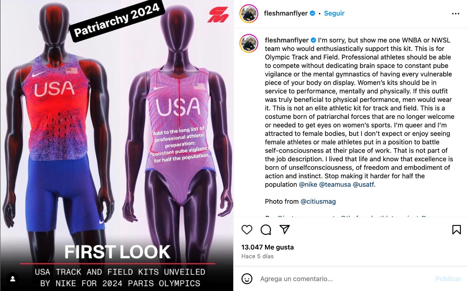 “Las atletas profesionales deberían poder competir sin dedicar espacio cerebral a la constante vigilancia del pubis o a la gimnasia mental de tener cada parte vulnerable de su cuerpo en exhibición. Si los labios vaginales cuelgan de un maniquí inmóvil, ¿qué esperamos que le pase a una persona en movimiento?”, escribió la campeona nacional en los 5 mil metros.