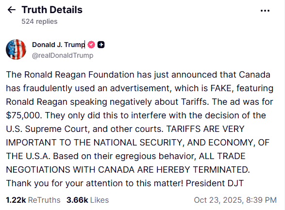 “La Fundación Ronald Reagan acaba de denunciar que Canadá utilizó fraudulentamente un anuncio, completamente FALSO, en el que aparece Ronald Reagan criticando los aranceles. Este anuncio, con un costo de 75 mil dólares, fue realizado únicamente para interferir en las decisiones de la Corte Suprema de Estados Unidos y otros tribunales”, escribió el mandatario en su plataforma Truth Social.