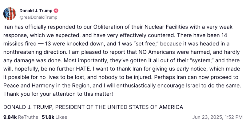 “Irán ha respondido oficialmente a nuestra destrucción de sus instalaciones nucleares con una respuesta muy débil, algo que esperábamos y que hemos contrarrestado con gran eficacia. Se han disparado 14 misiles: 13 fueron derribados y a uno se lo dejó ir, ya que se dirigía en una dirección no amenazante”, escribió Trump en el primero de los mensajes recién publicados en Truth Social.
