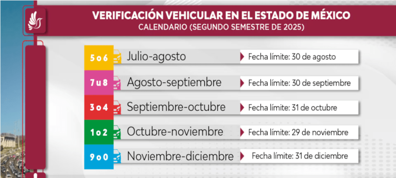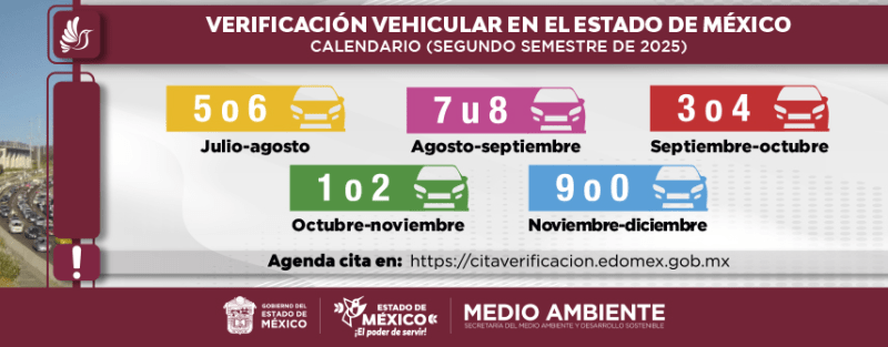 La Secretaría de Finanzas del Estado de México informó que durante el periodo octubre-noviembre de 2025, deben acudir a los verificentros los vehículos con placas terminadas en 1 y 2 y engomado verde. La fecha límite para cumplir con este trámite es el 30 de noviembre.